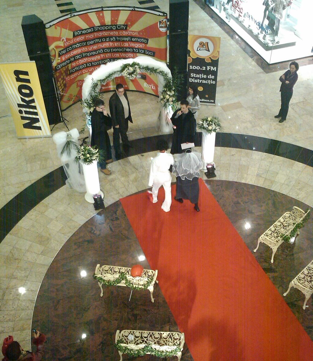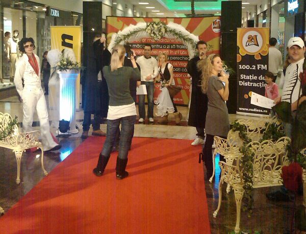 Ieri şi azi cei de la Radio 21 au căsătorit la mişto cuplurile care erau dispuse să se dea în spectacol în mijlocului mall-ului din Băneasa. Mirele era echipat cu un papion, mireasa cu un voal alb şi era apoi adusă la altar de un imitator al lui Elvis (?!?), unde doi MC (suficient de enervanți încât să te întrebi dacă MC nu vine cumva de la “mancător de kkt”) ai radio-ului îi cununau de formă până duminică la miezul nopţii.