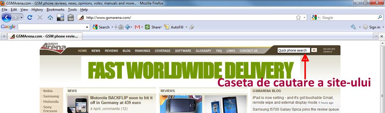 3. Mergeţi pe site-ul pe care doriţi un shortcut pentru căutare. Ca exemplu, eu am mers pe GSMarena.com, un bază de date pentru telefoane mobile. Identificaţi caseta de căutare în acel site, cea pe care aţi utiliza-o în mod normal.