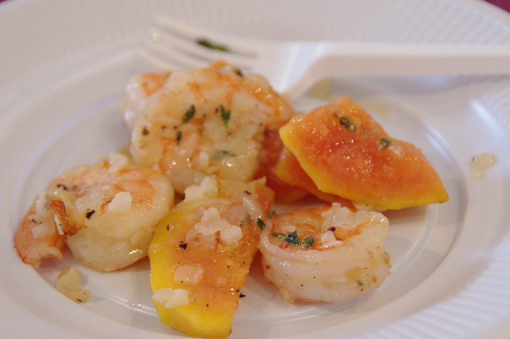 Ce am mâncat? Am început cu creveţi făcuţi cu usturoi și ceapă şi serviţi alături de bucăţi de papaya coaptă, poate şi cu un pic de cimbru adăugat. Foarte buni, mai ales că eu sunt mare fan al creveţilor încă de când am mâncat pe sparte în Portugalia, acum 3 ani.