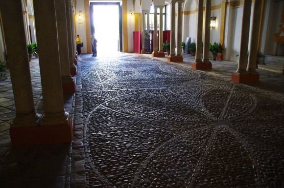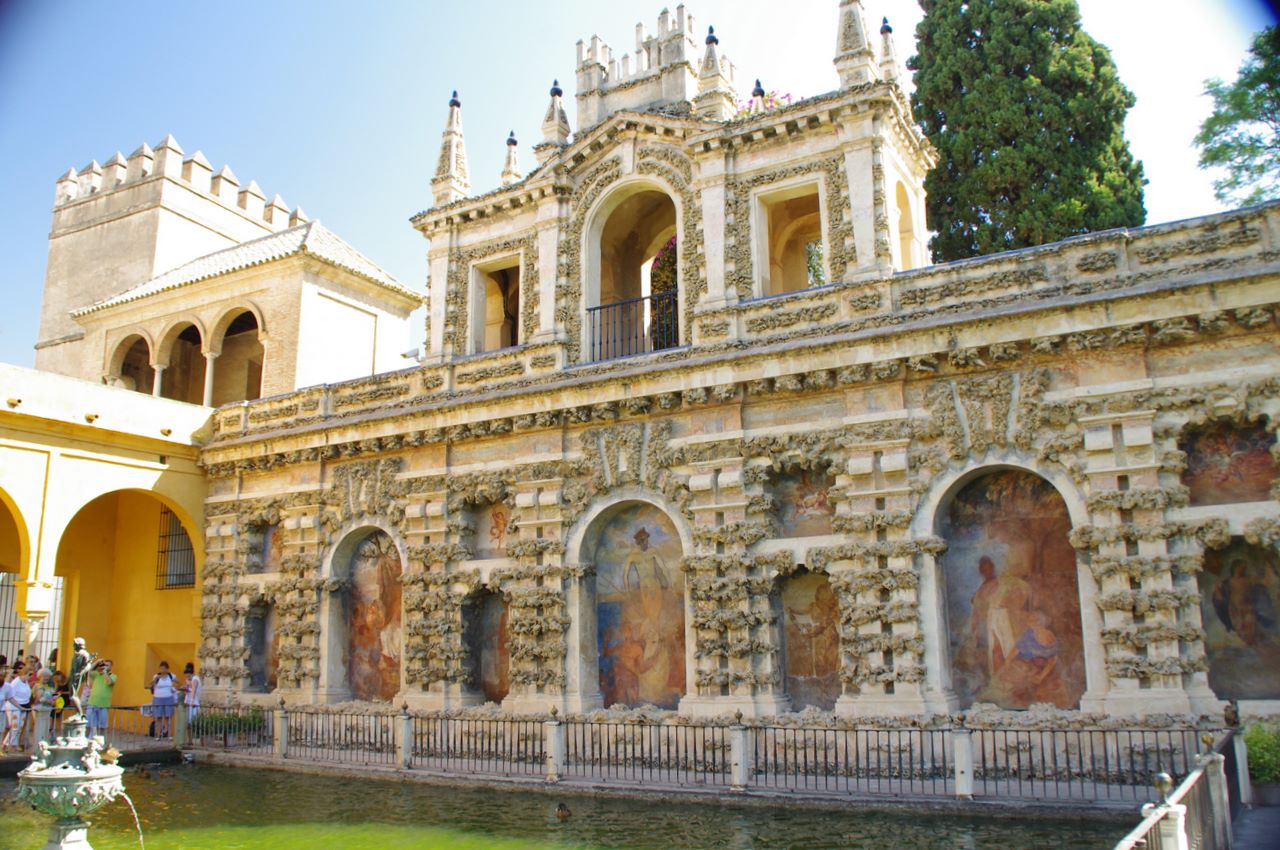 Vizavi de catedrala se găseşte Alcazarul din Sevilla, adică vechiul palat maur, păstrat de catolici după Reconquista şi care acum face parte din patrimoniul naţional. A fost cel mai frumos palat pe care l-am văzut în Spania până când, după câteva zile, am ajuns şi la Alhambra. De pe locul 2 însă nu l-a detronat nimic. Nu mai ştiu cât a costat intrarea, vreo 7-8 euro, dar daţi aceşti bani şi intraţi acolo. După cum vedeţi şi din imagini, are acel aspect de palat arăbesc, cu modele sculptate în tavan şi în pereţi, cu grădini interioare şi fântâni şi răţuşte şi palmieri înalţi şi ziduri pictate. Am văzut aici inclusiv un păun umblând liber prin grădina imensă din spatele palatului, însoţit de cei trei pui ai săi. Nu mai văzusem niciodată pui de păun.