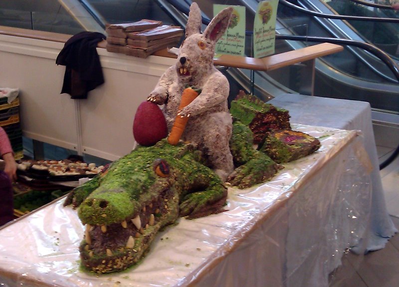 Un pic bizar era acest crocodil gigantic ce părea făcut din ciocolată sau din salam de biscutiti şi pe care îl călărea în mod pervers un iepure.