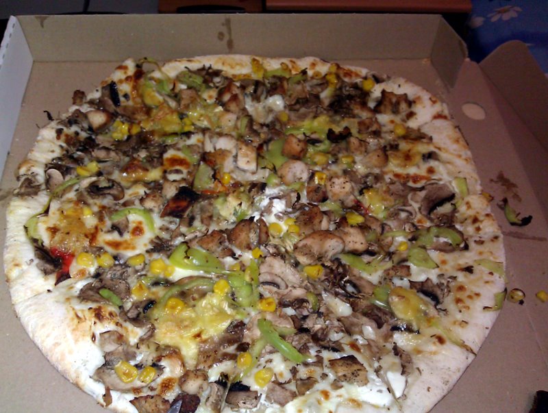 @ipo: eh, e pizza, trebiue sa fie buna, nu aratoasa. Am fotografiat-o la vreo 20 de minute dupa ce a fost facuta si nu mai era la fel de apetisanta. Ma asteptam sa fie cu mai multa smantana, dar a fost chiar buna combinatia cu branza.