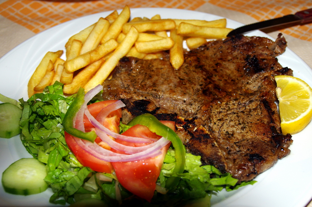 În ultima noapte în Corfu am mers la restaurantul numit Oceano. Era patronat de un grec care cred că-şi punea şi fiica la muncă în local. Ca aperitiv am vrut un fel de bruscheţe, aici fiind pâine cu roşii şi brânză feta, trecută prin cuptor. A fost atât de bună încât am mai comandat ulterior o porţie. 2,5 euro m-a costat porţia, din câte ţin minte. Un cocktail de creveţi, servit în pahar şi cu sos, a fost vreo 5,5 euro. Pentru felul principal am vrut carne de vită, iar grecul mi-a recomandat T-bone steak, servită cu cartofi şi salată. A fost foarte bună, chiar dacă cea mai scumpă din meniu la 15 euro, însă era ultima seară şi na, poate a doua zi muream în avion. O caracatiţă aici costă doar 9 euro şi era la fel de bună ca la San Carlos, semn că preţurile oscilează multişor.