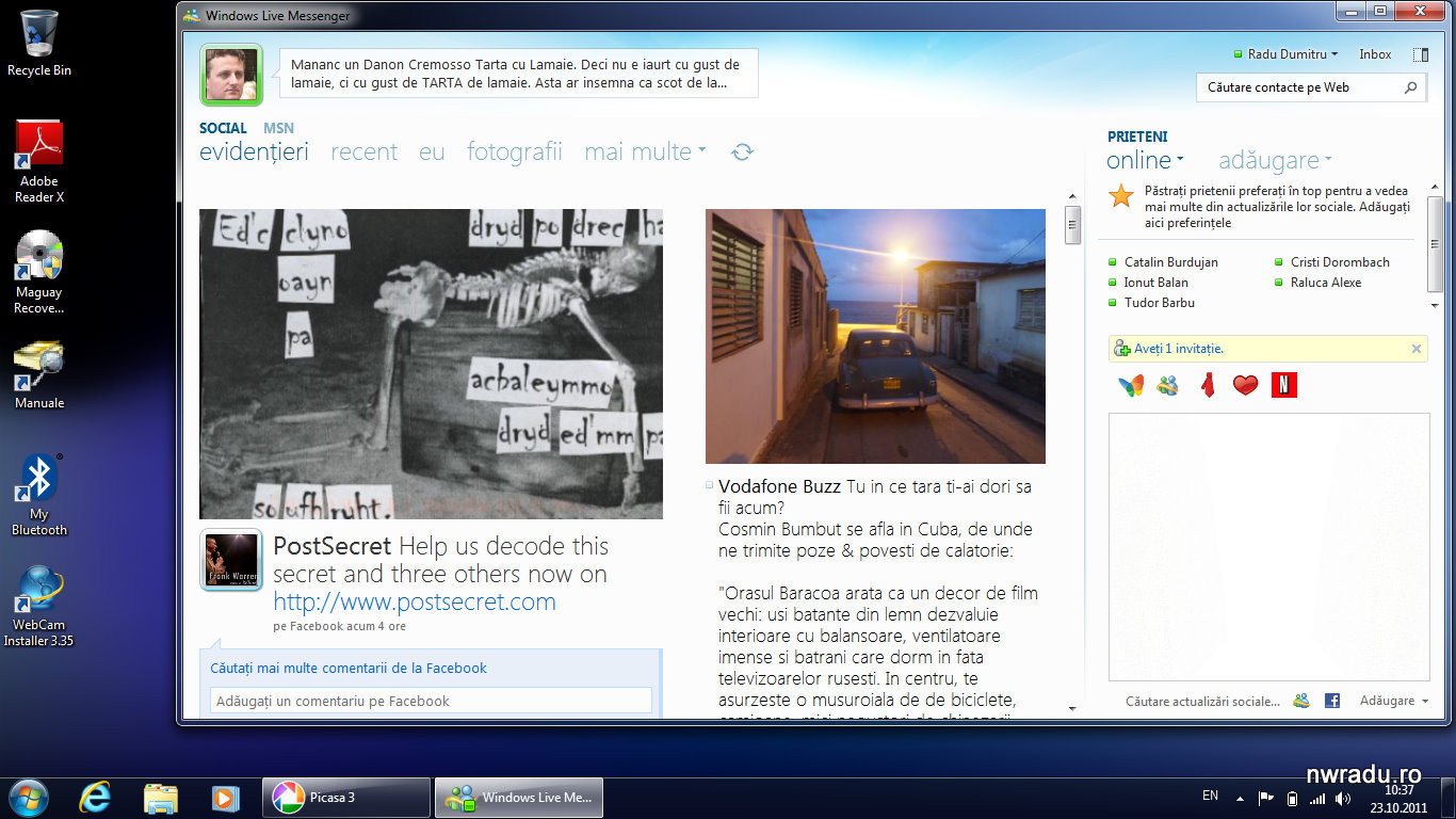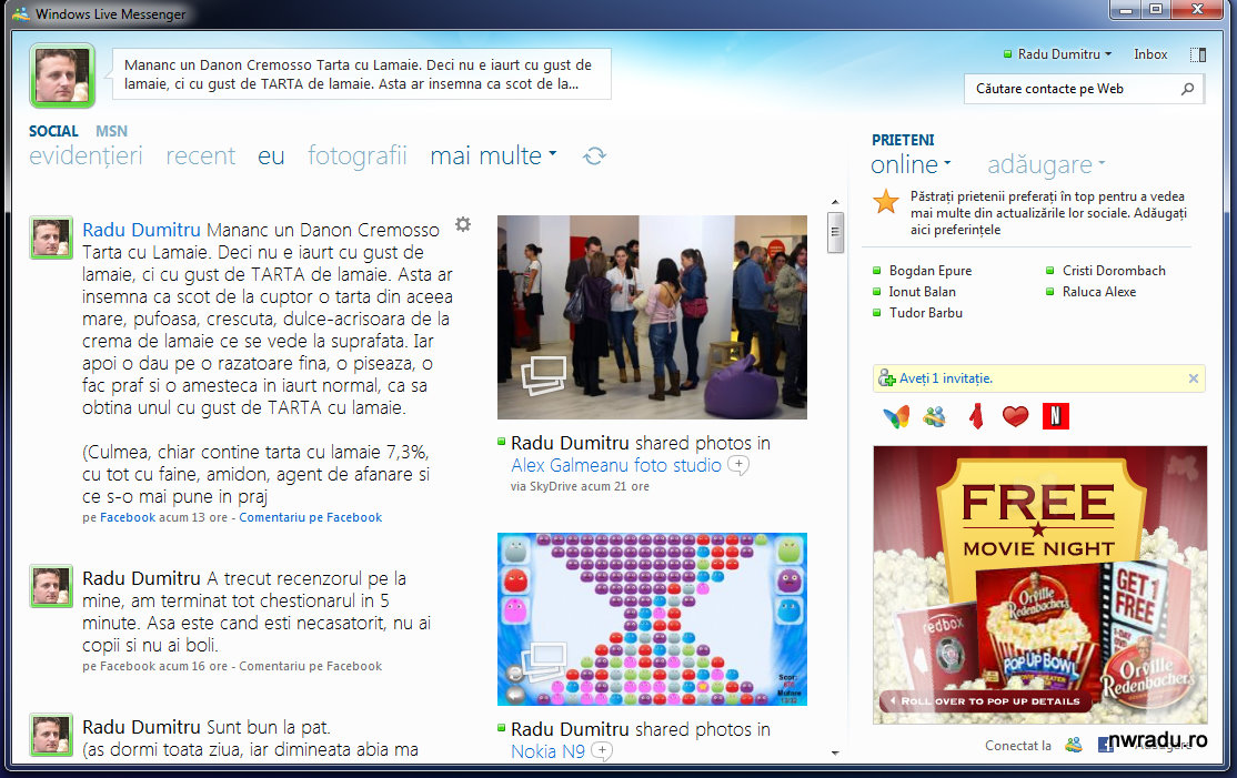 Softul e genial. În partea stângă a ecranului îmi arată update-urile importante ale prietenilor de pe Facebook, iar în dreapta e lista de contacte online, cea din chat-ul Facebook. Pot vorbi direct cu cei de acolo, eu în Live Messenger şi ei în interfaţa Facebook din browser şi pot să comentez la orice status al cuiva şi comentariul apare direct în Facebook.