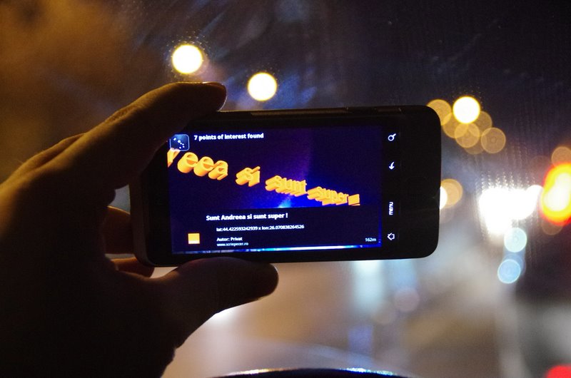 Daca adaugi un mesaj, atunci cand il pozitionezi iti arata cate altele sunt deja pe harta. E misto sa mergi prin oras cu layar pornit si sa vezi ce-au mai scris unii. Am gasit “iesim la un vin fiert?” pe Grivita, un “Sunt Andreea si sunt super” prin alta parte, cate un “te iubesc” etc