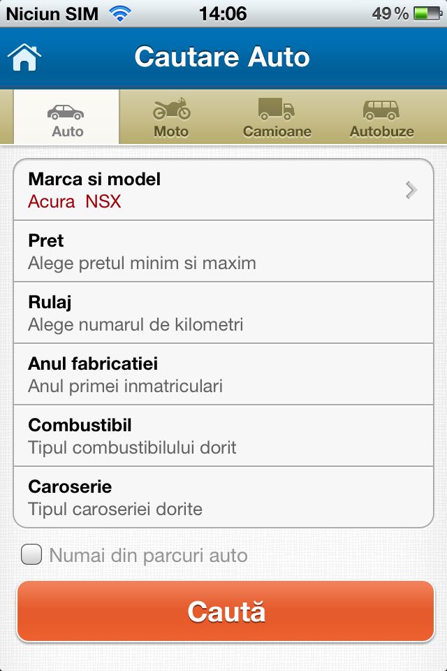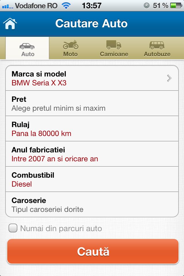 Pe lângă funcÈ›iile de mai sus, poti căuta direct din aplicaÈ›ie în anunÈ›urile de vânzari SH de pe site-ul auto.ro, o funcÈ›ie care va rezolva multe discuÈ›ii de pahar de genul “nu mă, găseÈ™ti sigur Ford Focus din 2009 la 8000 de euro, îți zic eu!”