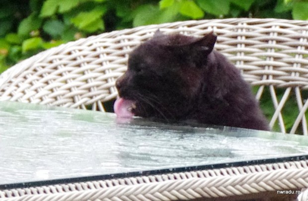 O pisică s-a ridicat în două lăbuţe, a pus capul pe masă şi a început să bea apă strânsă acolo după ploaie. A făcut asta mai bine de un minut. Dacă aş fi filmat cu zoom era un moment bun pentru emisiunile amuzante cu animale.