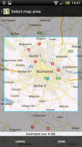 Înapoi la hartă şi apăsând opţiunea Make Available Offline, apare un chenar peste harta care-ţi spune câţi MB va ocupa porţiunea selectată. Un zoom ouţ pe harta îţi permite să alegi zone tot mai mari. Bucureştiul şi cu împrejurimile sale are 10 MB, de exemplu.