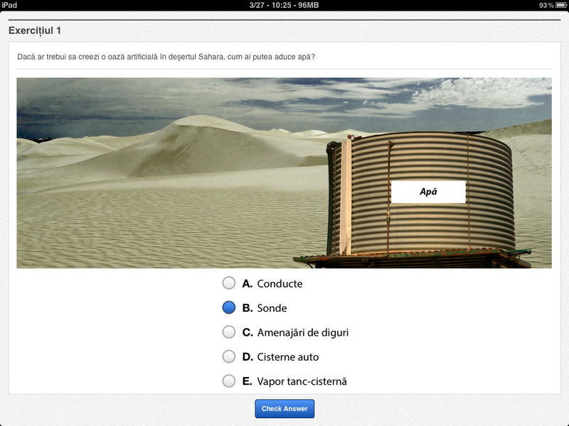 Mi-a plăcut ce-am văzut. Un manual pe iPad înseamnă culori vii, desene frumoase, scheme și grafice explicative, teste rapide în pagină, când ai de bifat răspunsul corect pentru a trece mai departe, și mai ales interactivitate și animații explicative. Înțelegi în 5 secunde dintr-o animație bine făcută despre vulcani sau circuitul apei în natură sau mișcarea planetelor decât din 10 pagini de text despre același subiect.