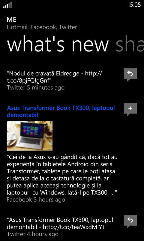 Windows Phone 8 îmi place tot mai mult. Sistemul de operare rămâne lider la capitolul integrarea Facebook și Twitter direct în telefon, prezentându-ți imediat update-uri de la prieteni, fotografiile acestora, mențiuni, ba chiar integrează direct și chat-ul de pe Facebook.