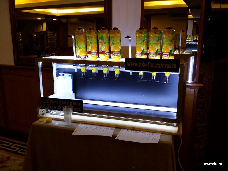 La intrarea în sala de relaxare se pot vedea robotul de făcut cocktailuri și harpa laser. Mai multe proiecte de acest tip găsiți pe robofun.ro/create.