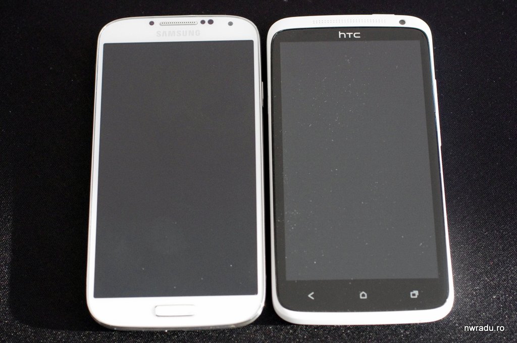 Iată-l mai jos comparat cu un SGS 3 (în dreapta) și un HTC One X. Dimensiunea este aproximativ aceeași, dar SGS 4 este mai puțin rotunjit în partea de jos.