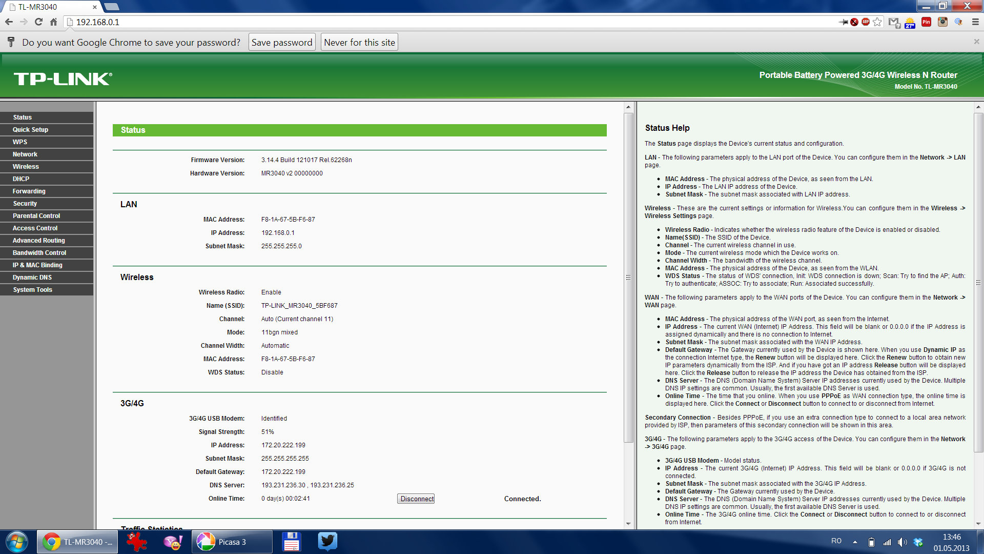 Conectarea la router este foarte simplă. Pornit pentru prima oară, el generează o rețea wifi al cărei nume și parolă sunt scrise pe spatele lui MR3040, sub capac. Odată conectat la ea, accesul în meniul de configurare se face din browser: