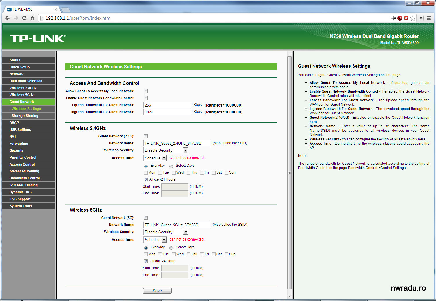 Guest Network. Pe lângă cele două rețele de mai sus, poți crea și două rețele wireless de tip Guest, pentru conectări temporare. Le poți da nume și parole diferite, poți limita banda disponibilă pentru ele, poți alege nivelul de acces în restul LAN-ului sau la stocarea conectată la router. Poți configura și un interval orar în care să funcționeze aceste rețele.
