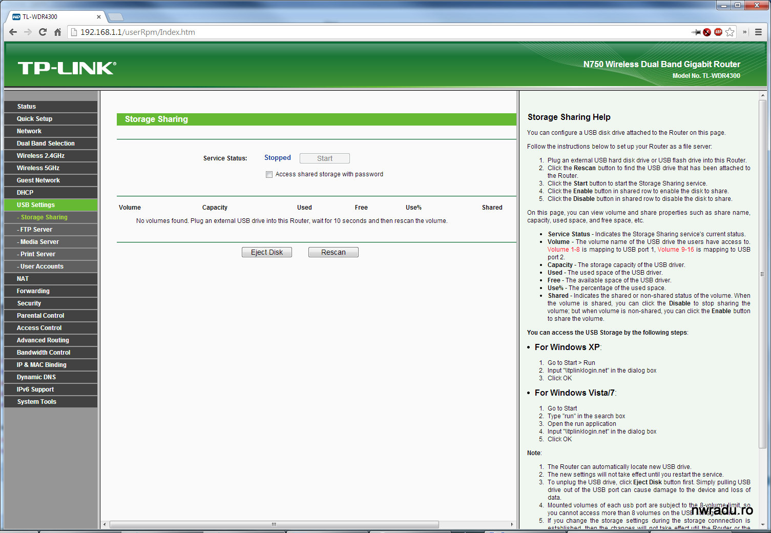 USB Settings. Am detaliat mai sus cam ce poți face prin conectarea unui hard disk sau a unui stick USB la router. Cu imprimantă nu am încercat, eu sunt adeptul imprimantelor wireless. Din acest meniu poți configura totul.