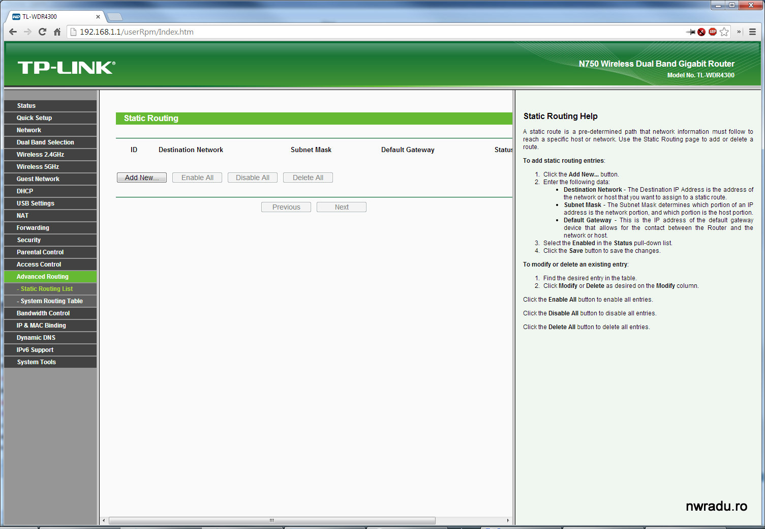 Advanced Routing. Aici ai acces la tabela de routare și poți introduce manual alte setări.