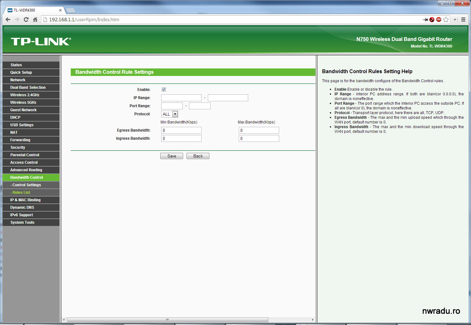 Bandwidth Control. Sub acest meniu se ascund de fapt opțiunile uzuale de QoS. Poți limita banda totală de net pentru fiecare IP în parte, pe protocol și port, dar totul se face manual. Nu exista opțiuni de configurare pentru aplicații individuale (adică să-i spui să-ți lase mereu 10 Mbps pentru browser), fiind un IP QoS.