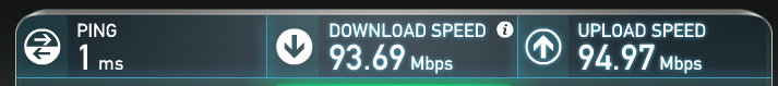 La mine acasă totul a funcționat perfect. Iată mai jos un test făcut cu desktop-ul conectat prin cablu la router, adică situația ideală. Conexiunea internă este de 1000 Mbps, dar viteza e limitată de operator la 100 Mbps.