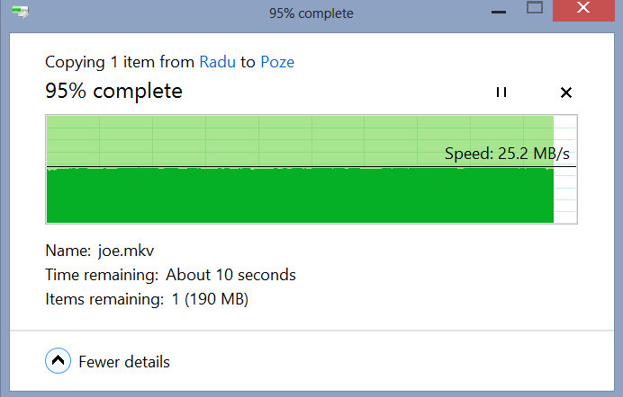 Cu alte cuvinte, acest test verifică doar conexiunea wireless a laptopului, desktop-ul fiind conectat prin cablu pentru a nu introduce eventuale întârzieri. Mie rezultatul mi se pare foarte bun, acel 25 MB/sec constant (observați graficul) înseamnă 200 Mbps transfer efectiv, o cifră foarte bună.