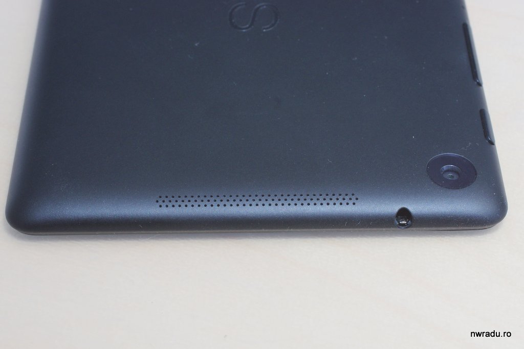 Tot pe spate se găsesc și două difuzoare, sus și jos. Pe latura superioară am găsit jack-ul audio, jos conectorul microUSB. Dacă alegi varianta cu 4G, slotul de microSIM este pe latura dreapta, accesibil după ce-l deschizi cu ajutorul unui ac lung.