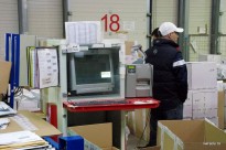 Am înțeles că seara se adună coletele și plicurile ridicate în timpul zilei pentru a fi trimise în București sau în țară și străinătate. Mașinile vin din oraș cu noile pachete ce trebuie livrate, cutiile sunt descărcate în depozit, de unde pornesc pe benzile transportoare spre un scanner care le ia în evidență pe baza etichetelor lipite pe ele. Dacă o etichetă este deteriorată, intervine factorul uman care o descifrează și printează pe loc una nouă, citeță, de la un post de lucru precum cel de mai jos.