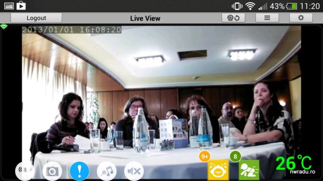 Sună bine. M-am conectat chiar și la cameră, luând pe loc aplicația mydlink Baby Camera din Google Play și am făcut screenshot-urile de mai jos. Observați în partea de jos a ecranului că-ți spune temperatura din cameră, precum și câte alarme de sunet și mișcare au fost declanșate.