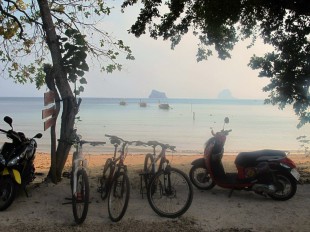 Stăm întinse pe nisip. Înotăm în mare. Ne răcorim la umbra unui palmier. Fresh de ananas. Sorbim din pahar. „Aahhhh”. Nici n-am ajuns bine şi deja începem să ne facem planuri cum să ne întoarcem. Să ne dăm demisia. Să ne mutăm pe insulă. Oare în sezonul ploios plouă zilnic? Cât o dura? La un moment dat ni se face foame. Din ghid ne face o terasă cu ochiul. „Sabai Corner”. Nu e chiar aproape, aşa că luăm un taxi până acolo. Taxiul e de fapt un „songthaew”, un fel de camionetă cu două bănci lungi în spatele descoperit, pentru pasageri. Majoritatea turiştilor închiriază scootere, noi însă n-am mers niciodată cu un scooter. „Mâine să închiriem şi noi biciclete…”, dar până atunci bem o bere tolănite în hamac, cu burţile pline şi privim marea. E minunat. Se văd insuliţele din golful Phang Nga. Ne întoarcem la plajă, intrăm din nou în mare, ne pozăm, facem câteva selfie-uri cu strâmbături de colecţie. E biiineee!!!