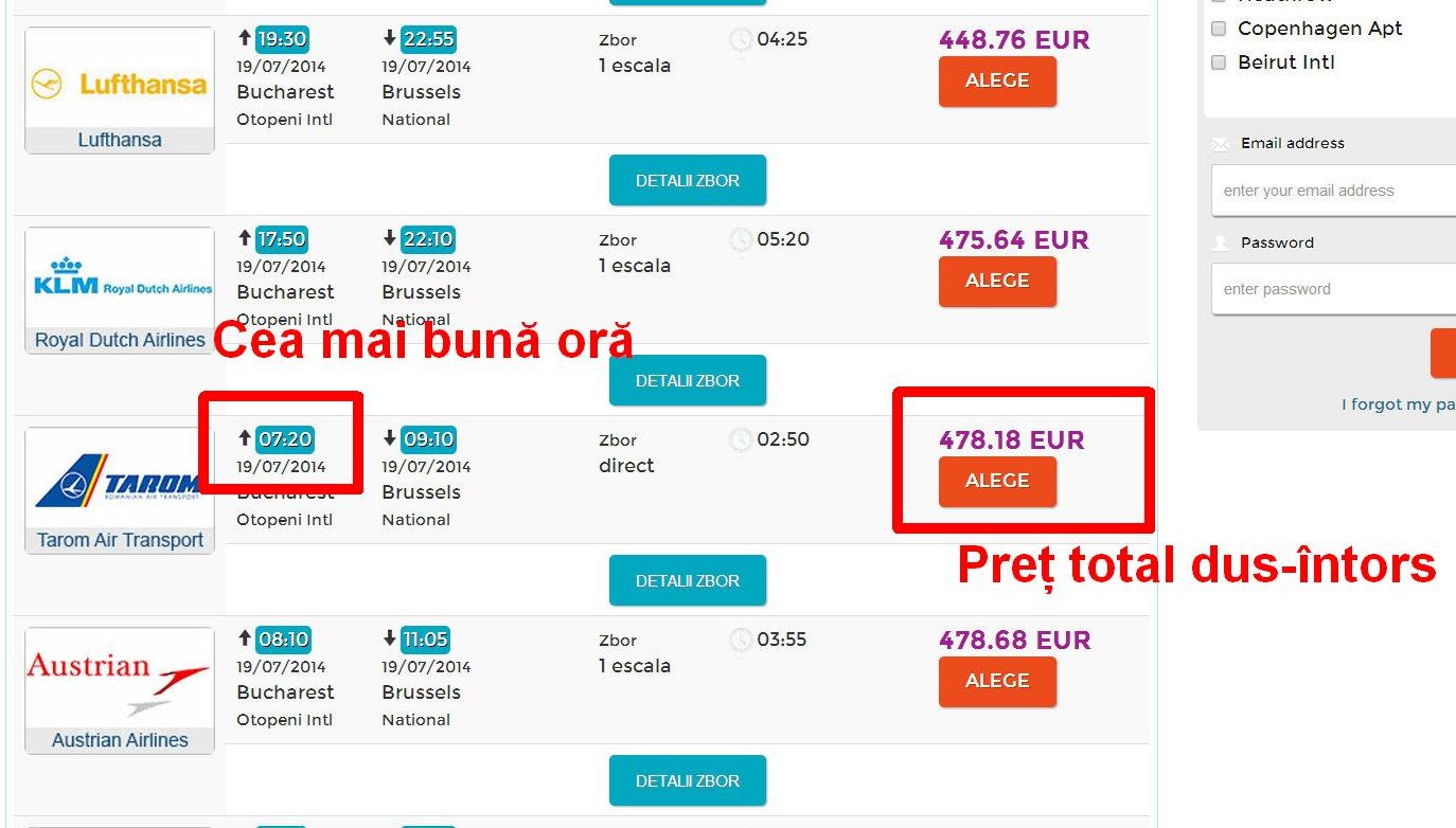 Alegi numărul persoanelor, destinația și data la care vrei să călătorești. În primul pas alegi zborul de plecare; mie îmi place unul cât mai devreme, ca să nu pierd ore prețioase din prima zi. Prețul afișat include deja și returul cu cea mai ieftină soluție. În al doilea pas, poți alege alt zbor de retur, în funcție de ora sau compania pe care o preferi.
