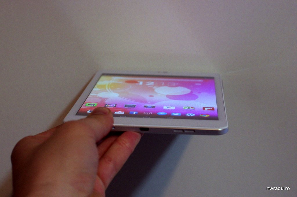 Butoanele sunt pe dreapta, On/Off și volum, argintii. Au o cursă bine calibrată și funcționează bine. Undeva mai jos, tot pe dreapta, se află slotul microSIM protejat de un capac și slotul microSD neprotejat, ceea ce înseamnă ca pe acolo poate intra praf și că din neatenție poți strica cardul de memorie. Nu este singura tabletă cu acest slot neprotejat, dar nu-mi place această idee.