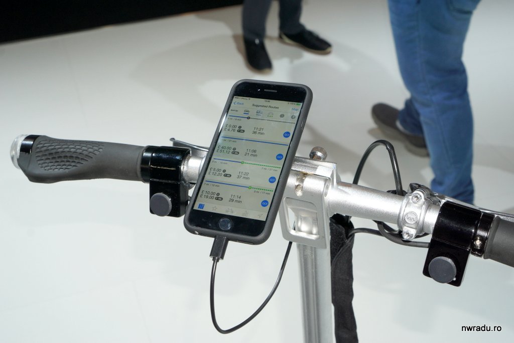 Telefonul mobil poate fi pus în suportul de pe ghidon și beneficiezi de navigație pe rute potrivite bicicletelor, precum și informații despre starea bateriei. Ca și la cea Smart, bănuiesc că bateria se încarcă la frânare sau vale, dar și la priză.