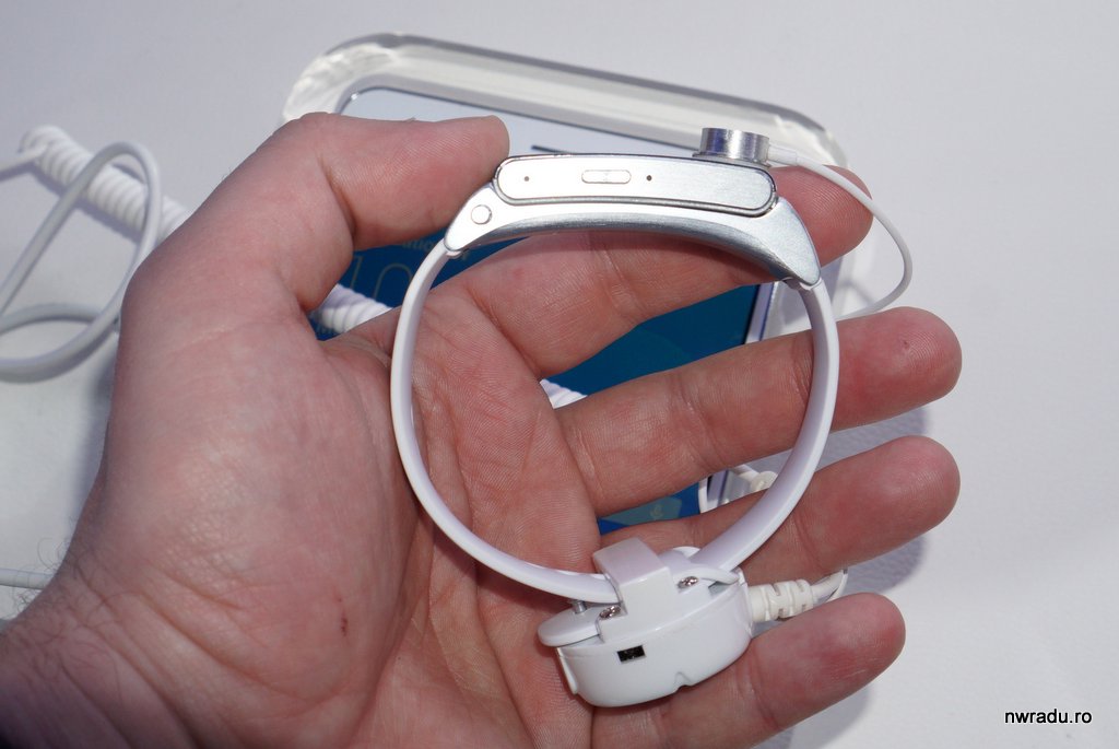 Dacă apeși cele două butoane mici de pe laterale, vei observa că partea principală se detașează și devine o cască bluetooth de purtat la ureche. Are și microfon special pentru anularea zgomotului de fundal. Este un exemplu perfect de aparat 2-în-1, mai ales că funcționează cu orice telefon, având aplicația dedicată pentru Android și pentru iOS.