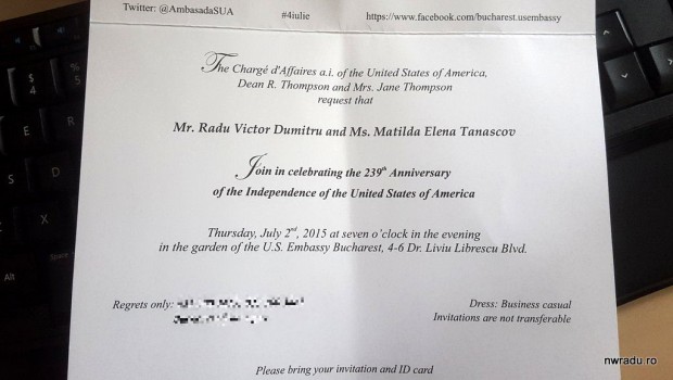 Invitația arată ca mai jos, cu o copertă frumoasă. Bănuiesc că ne-au studiat înainte și notele din școala generală, că nu intri așa ușor în ambasadă.