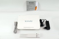 Tenda W1800R este un model alb, bine făcut, cu un plastic ce pare de bună calitate și îmbinări solide. În partea de sus, sub sigla mărișoară Tenda, se află LED-urile de semnalizare, unele verzi și nu foarte luminoase.