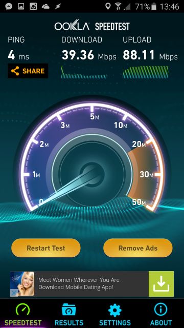 Ca bandă, în cele mai îndepărtate colțuri ale casei oricum aveam 39 și respectiv 47 Mbps download și mai mult pe upload, o viteză foarte bună care permite nu doar browsing fără probleme, dar și streaming video și jocuri online.