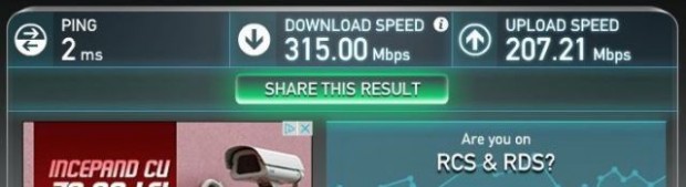 Să trecem direct la cifre: cea mai mare viteză prinsă pe wireless a fost 315 Mbps, pe speedtest. Asta am reușit cu o placă wireless conectată în PC pe PCI-Express, placă de mare capacitate. Rezultatul este bun. Nu-i extraordinar, dar aș spune că este proporțional cu prețul routerelor față de prețul altor routere cu care am avut rezultate un mic mai bine (gen 365-400 Mbps).