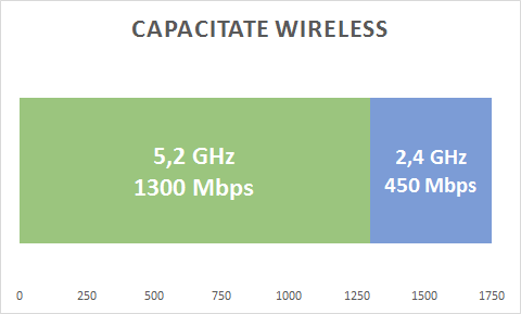 De ce are atunci 1750 Mbps capacitate totală? Așa cum explic de fiecare dată inclusiv prin alegerea termenului “capacitate totală”, astfel de routere sunt gândite pentru a conecta simultan multe dispozitive, fiecare accesând Internetul, urmărind prin streaming vreun film sau downloadând fișiere. În practică, fiecare calculator sau telefon ajunge în general la 100 Mbps, hai 200 Mbps, deoarece antenele lor interne sunt limitate (de asta eu testez cu o placă wireless pentru desktopuri).