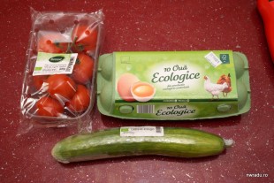 Am luat roșii ciorchine ecologice marca Biotrend la 4,44 lei caserola și castravete ecologic marca Biotrend. Salata a fost una “mixtă Lollo” de 3,99 lei/bucată, dar merge orice salată verde aici, noi am luat ce-am găsit. Am luat și 10 ouă, tot ecologice, la un preț chiar bun, 8,78 lei pachetul deși de obicei costă vreo 12 lei în rest. Puteți folosi roșii, castraveți, ouă și salate normale, dacă vreți, noi le preferăm pe cele bio pe cât posibil.