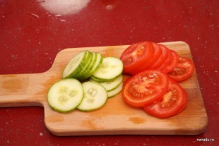 2. Am tăiat felii subțiri roșiile și castraveții și am rupt 6 frunze de salată pe care le-am spălat foarte bine. Pe primii doi burgeri am pus câte o felie de salată, pe următorii câte două. Roșii și castraveți puneți câte 2-3 felii pe fiecare burger; mă enervează restaurantele în care găsesc doar o felie de roșie în burger, de zici că s-a rătăcit pe acolo.