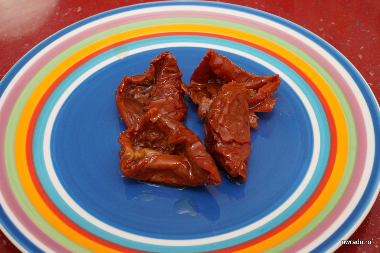 4. Scoateți câteva bucăți de roșii deshidratate din borcan, cam 2-3 pentru fiecare burger în care veți pune. Scurgeți-le un pic de uleiul în care stau în borcan.