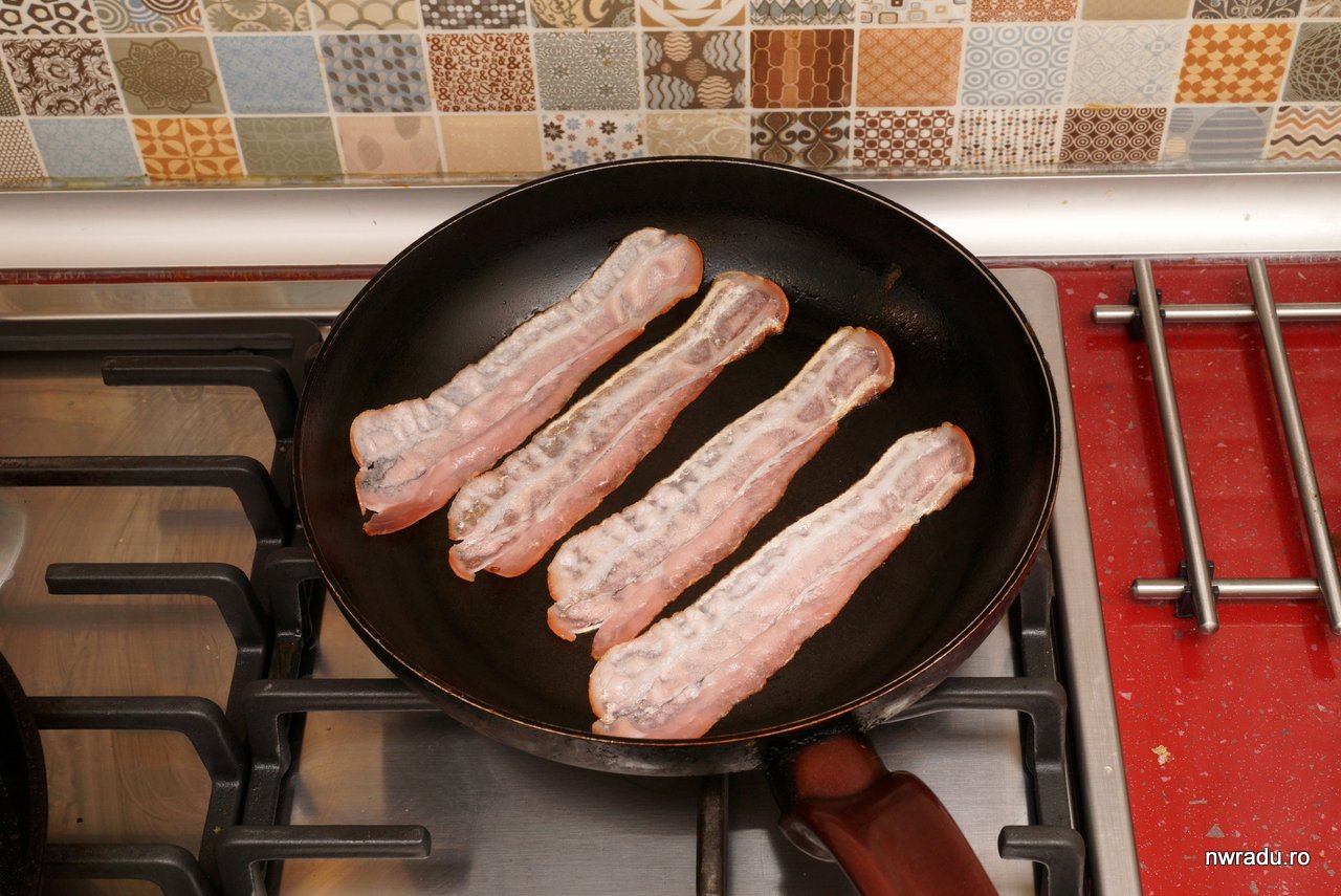 7. Puneți feliile de bacon în cealaltă tigaie, tot fără nici un fel de ulei sau unt și tot la foc mediu. Se va topi din grăsimea baconului. Nu-l prăjiți foarte tare, ideea e să nu fie crud. Cu un clește sau o furculiță întoarceți-l pe partea cealaltă și mai prăjiți-l un pic, apoi scoateți-l pe un șervețel ca să se scurgă grăsimea. Bacon-ul se va întări și va deveni ușor crocant, manevrați-l cu grijă după acest moment.