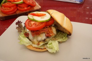 Acesta e burgerul! A fost foarte bun, am dimensionat corect cantitatea de ingrediente, dar voi puteți să vă jucați cu cantitățile de brânză, bacon și legume, după preferințe.