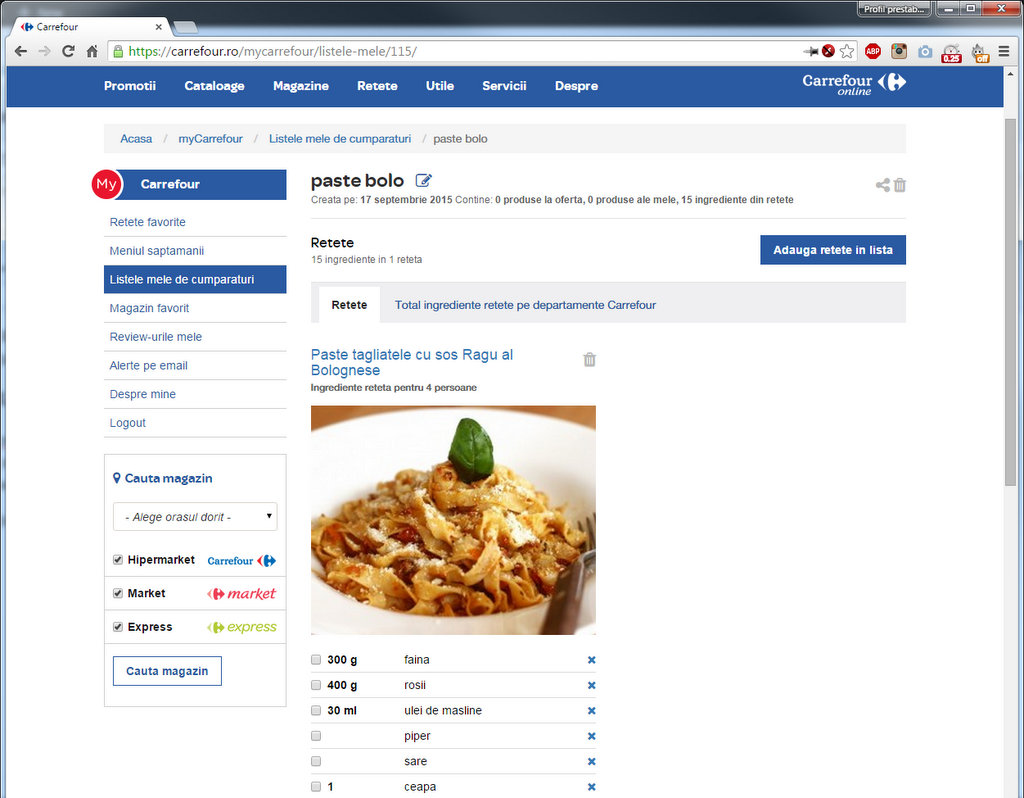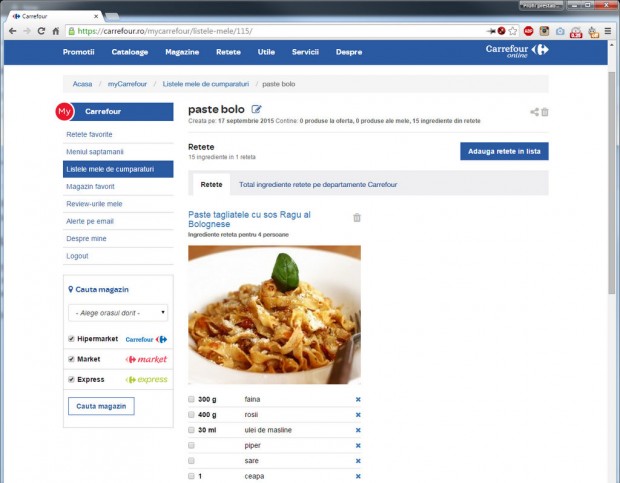 O altă secțiune a site-ului este cea MyCarrefour, unde ai diverse alte servicii la dispoziție. De exemplu, poți adăuga direct ingredientele dintr-o rețetă într-o listă proprie de cumpărături. Listele de cumpărături au marele avantaj că vin cu link individual și le poți arăta altei persoane, de exemple soțului/soției, pentru a ști ce aveți de cumpărat.