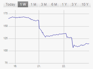 Compania a pierdut 35% din valoarea acțiunilor în două zile. 35%! Să vedem cât se mai duce în jos. Iată evoluția din ultima lună, ca să vedeți căderea masivă cauzată de scandal, și din ultimele două zile.