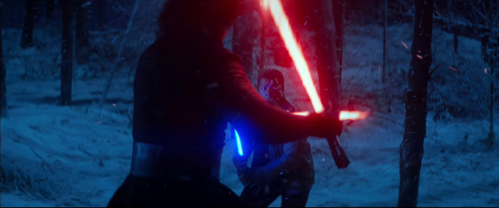 Apoi, tot într-o secvență de noapte și lupte, deci un pic mai târziu, Finn deschide o sabie laser albastră, o culoare din care a avut în trecut Luke, și se luptă direct cu Kylo Ren (îmi tot vine să-i spun “o mie de reni”). Poate că Luke tocmai murise? Poate că atunci este momentul în care Forța se trezește, la moartea lui Luke, și o nouă generație de oameni speciale se va lupta pentru binele galaxiei?