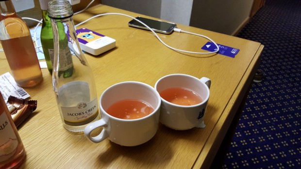 După aproape 20 de kilometri de mers pe jos în prima noastră zi în Londra, ne-am relaxat la hotel cu o mini-șampanie cumpărată din magazin și băută din ceștile găsite în cameră.