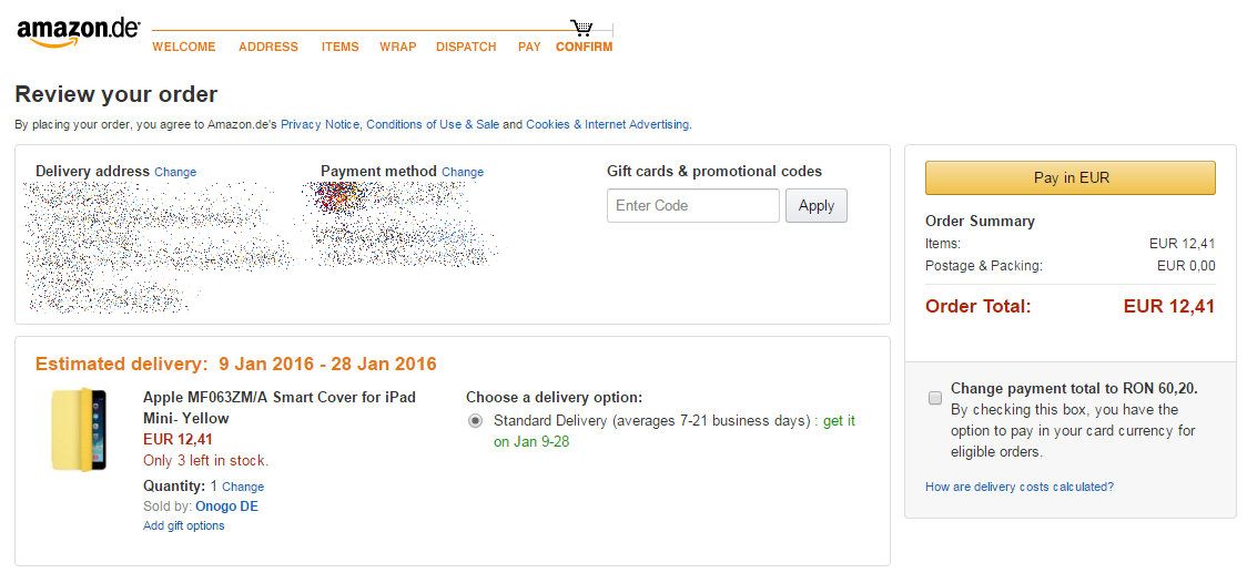 Lăsând la o parte diferențele acestea ciudate între același produs, dar de culori diferite, nu uitați de acest aspect atunci când vă uitați la prețurile de pe Amazon Germania sau SUA: prețul real îl veți afla abia după ce introduceți produsul în coș, alegeți adresa de livrare și modul de livrare, că abia atunci vor fi calculate toate taxele. Fără această simulare, orice discuție de genul “pe Amazon e mai ieftin” nu-și are rostul.