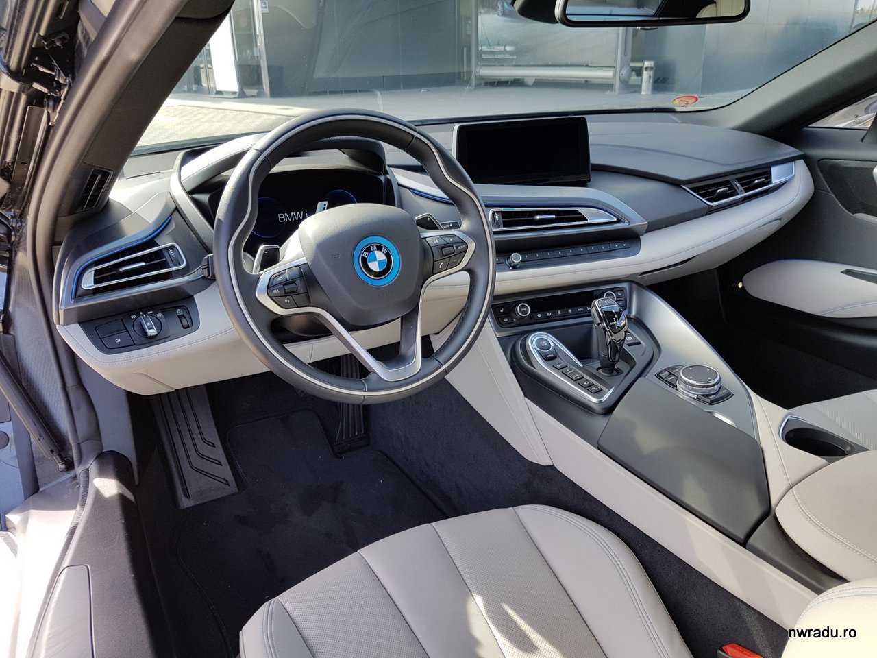 Scaunele sunt foarte confortabile, BMW i8 pare genul de mașină pe care o poți conduce mai multe ore fără să te dai jos din ea amorțit. Spațiul interior mi s-a părut neașteptat de mare, atât șoferul cât și pasagerul practic se lăfăie acolo, iar în imagini puteți observa și cât de lată este coloana centrală între scaune. Sistemul audio este de bună calitate, bordul este un ecran color de înaltă rezoluție, suplimentat de un ecran suplimentar pe centru, pentru navigație și multimedia, plus un heads-up display pe parbriz, dacă-l alegi din opționalele disponibile.