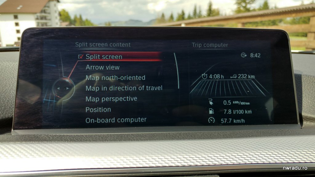 Sistemul de entertainment este, de asemenea, bine gândit. Poți împărți acel mare ecran în două, cu informații diferite în fiecare “fereastră”. Nu știam asta, dar rotița mare iDrive este un senzor tactil foarte precis ca rezoluție și poți scrie pe ea. Adică atunci când trebuie sa introduci o adresă poți naviga pe ecran din caracter în caracter, dar poți să scrii direct fiecare literă cu degetul pe acea rotiță, cu o viteză destul de mare, și mașina le recunoștea perfect.