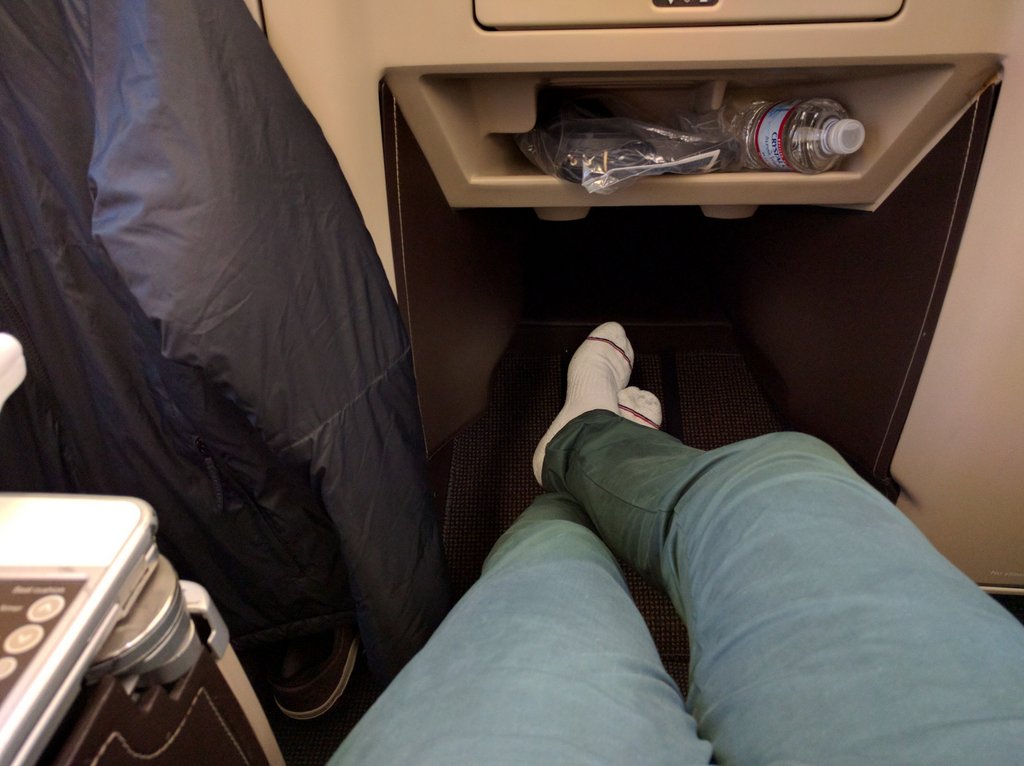 Lăsând meniul la o parte, mi-a plăcut în primul rând scaunul. Observați telecomanda acestuia, are reglaj pentru duritatea șezutului, reglaj lombar pe 4 direcții și funcție de masaj. Încă țin minte zborul spre Mauritius și cum n-am putut dormi în nici o poziție într-un scaun Economy, iar o funcție de masaj sau loc de întins picioarele ar fi fost un cadou de la divinitate.