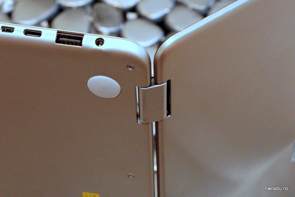 Balamalele sunt rezistente, ecranul se mișcă foarte puțin atunci când apeși pe el, dar dacă ar fi fost mai dure balamalele ar fi devenit dificil de deschis.. Laptopul este un 2-în-1 grație acestei balamale duble, un sistem foarte simplu și fiabil în care și baza, și ecranul se pot răsuci în interiorul ei. Practic, cu așa o balama simplă, de ce să nu faci laptopul un 2-în-1? Nu apare nici un dezavantaj.